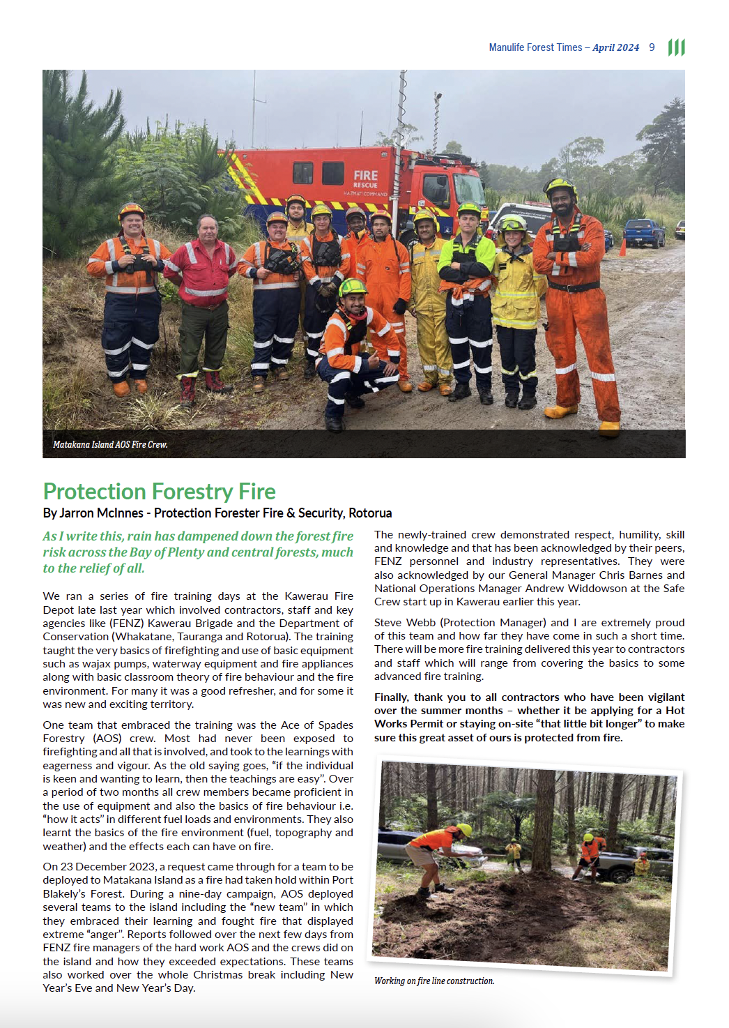 “Protection Forestry Fire”, page 9 of the Manulife Forest Times, April 2024 issue.